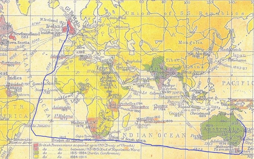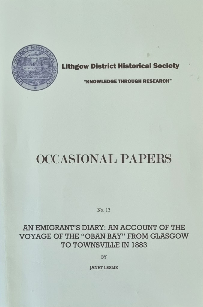 My lucky find – A diary of a fellow passenger named William Smart. The diary was transcribed by Janet Leslie in 1974. It is believed that Janet typed the book from the original handwritten diary. It is titled “An Emigrant Diary: An account of the voyage of the “Oban Bay“, from Glasgow to Townsville in 1883”. National Library of Australia ISBN 085866 014 8. William Smart is Janet Leslie’s grandfather.