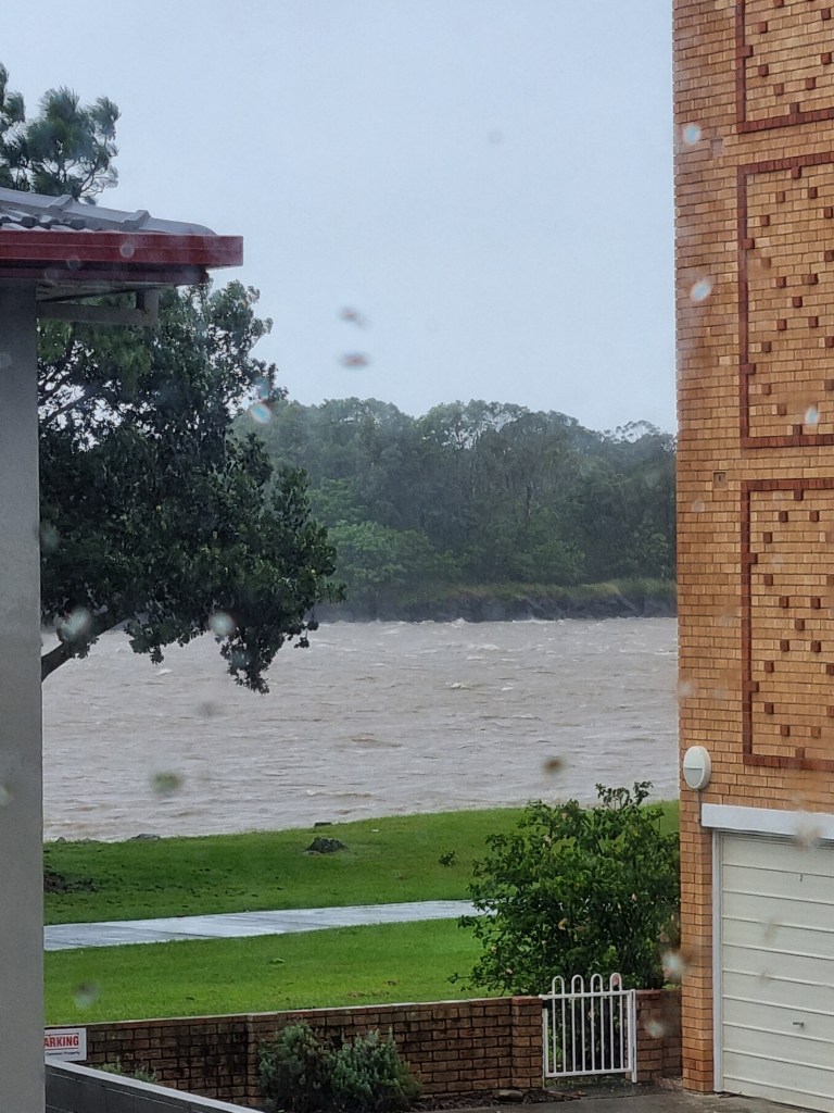 The last time I was in a cyclone was back in the 1970s and that was only the tail end. I go online and get details on how to prepare an emergency kit. It’s not from my state but Queensland! I take photos of every room. I get the opportunity to wander down toward the river to view what is happening. It’s a tidal river. The river mouth isn’t too far from where I live.