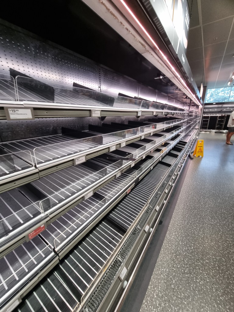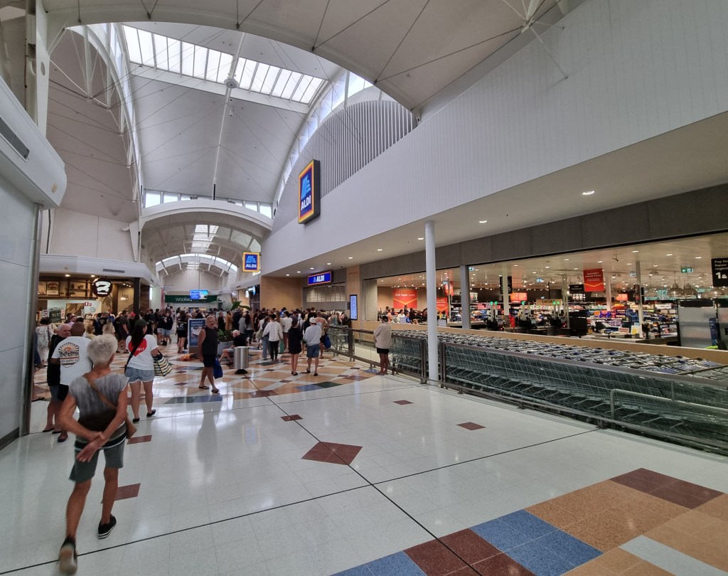 - The last three photographs: Left (Outside Aldi store in Tweed Mall), Middle (Empty shelves inside Aldi store in Tweed Mall), Right (Tweed River flowing toward the ocean)